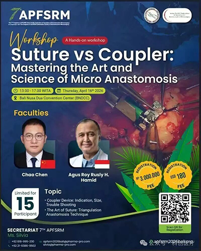 会上举办了以“手工缝合 vs 血管机械吻合”为专题的workshop,围绕显微吻合的艺术与科学展开深入探讨。会议由印尼专家Agus Roy Rusly H. Hamid主持,吸引了众多显微外科医生踊跃报名参与。
