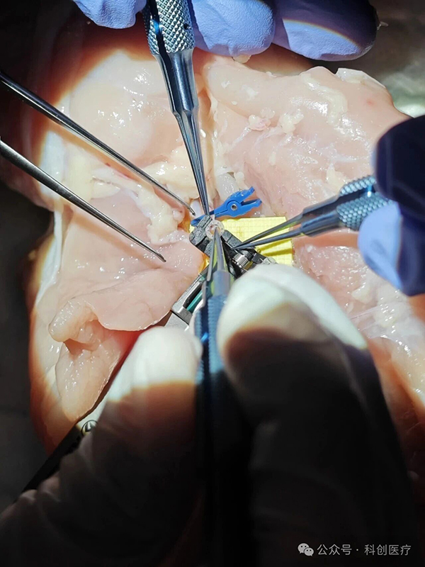 在理论授课环节,来自中国山东省立医院手足与显微重建外科的陈超教授带来了精彩演讲。他系统介绍了微血管吻合装置的临床应用适应症、规格选择策略以及常见问题的解决方案,并结合自身丰富的临床经验,分享了不等径血管吻合的核心技巧——这一临床难点在他的演示下变得清晰可操作。此外,陈超教授还展示了“科科夹”等系列产品在显微外科手术中的协同应用价值,让与会医生对中国创新产品矩阵有了更全面的认识。报名医生在陈超教授及全体指导老师的带领下,亲手体验了微血管吻合装置的实际操作。